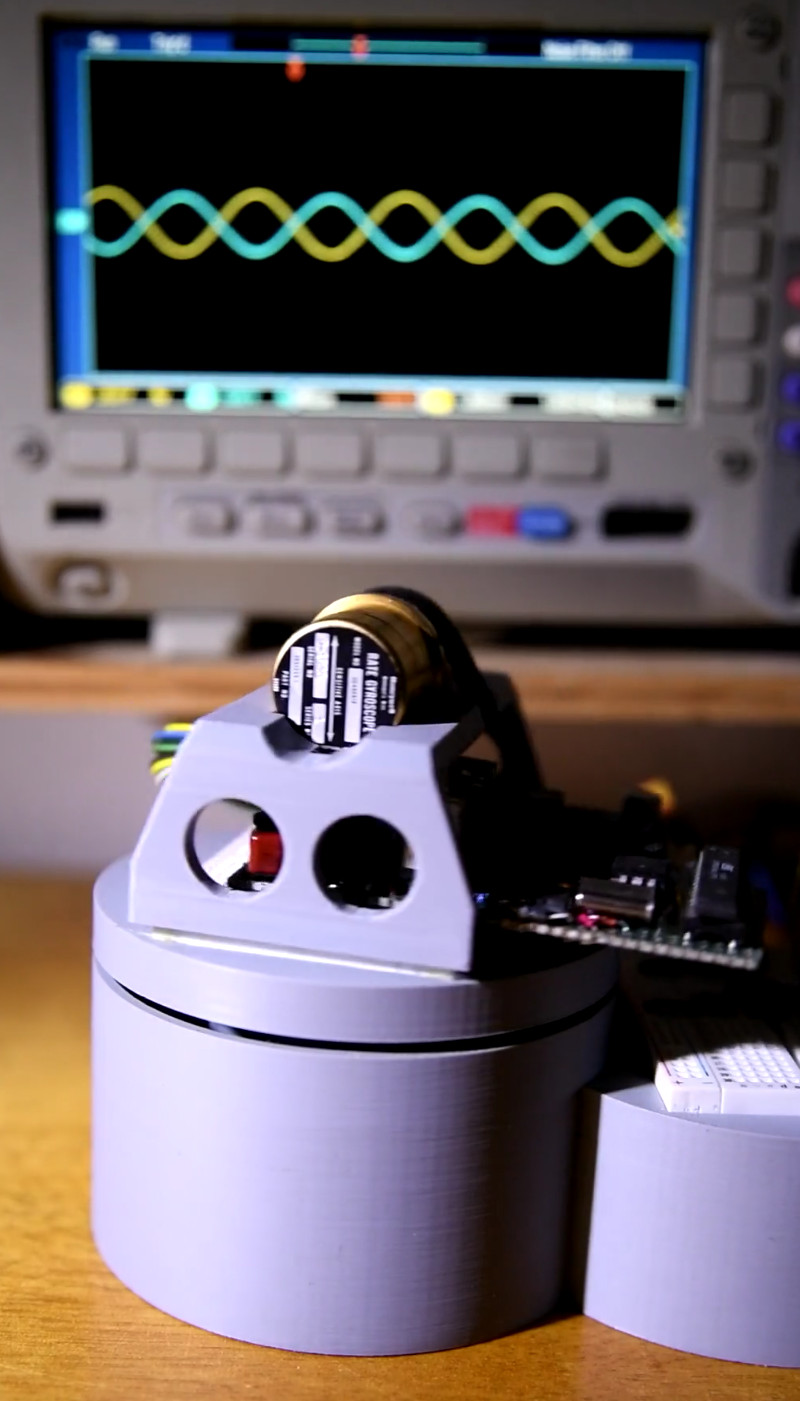 The blue LED is connected to SYNC, which is why a faint blue ghost of the spinning board in the aligned position is visible.