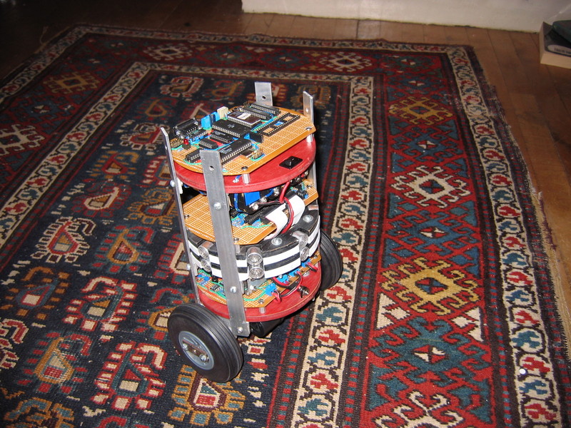 The onboard electronics were soldered by hand from large prototype boards, trimmed to fit on the 6" decks. The bottom level contains all the power systems and balancing control; the mid level contains the sensor systems; the top level contained the main computer, later replaced by a radio link to an offboard computer.